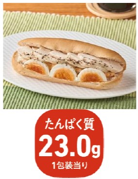 【内容】サラダチキンスライスとゆで玉子を組み合わせたたんぱく質が摂れるロールパンです。辛味と旨味を味わえるチリソ-ス風仕立てにしました。(1食あたりのたんぱく質23.0g)