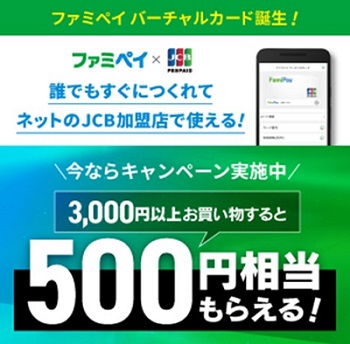 「ファミペイ バーチャルカード」を使って、ネットのお店(JCB加盟店)で3,000円以上利用すると、ファミペイボーナス500円相当を進呈いたします。