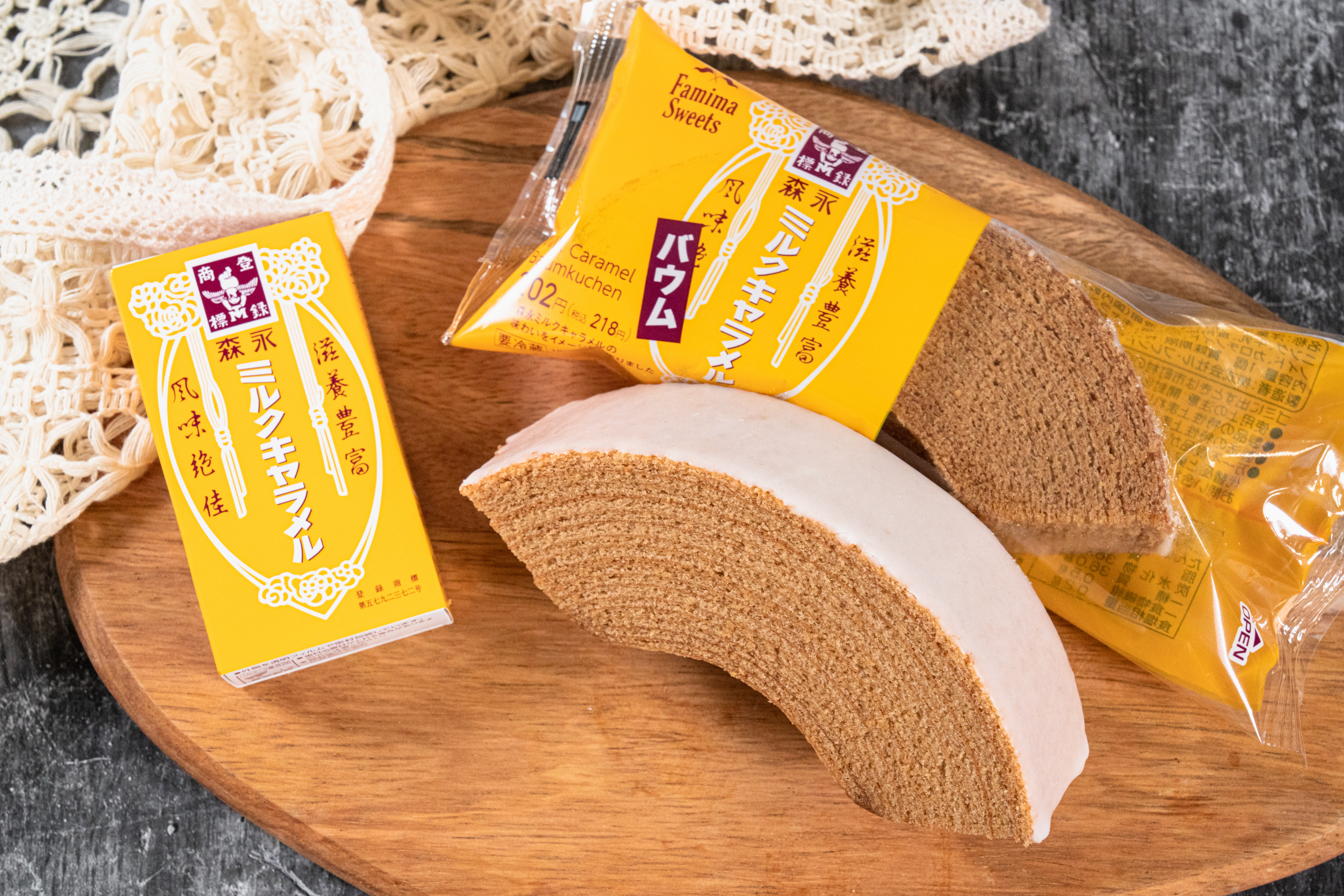 「ミルクキャラメルバウム」は、ファミマスイーツで人気の「しっとり食感のバウム」のおいしさはそのままに、森永ミルクキャラメルのやさしい甘さを引き立てるよう工夫いたしました。一口目からキャラメルの風味がしっかり感じていただけるよう、試作を重ねました。