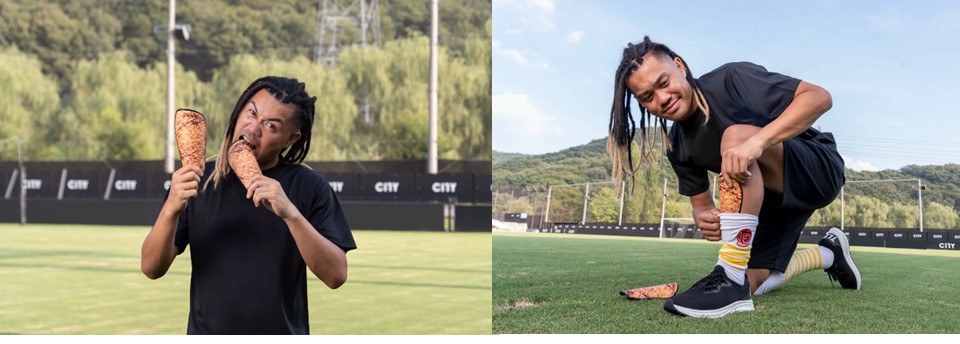 応援隊長の田中選手には、今回のキャンペーンで抽選で当たるオリジナルグッズのひとつである、ファミチキをモチーフにデザインされた「すね当て&ソックス」を実際に着用いただきました。