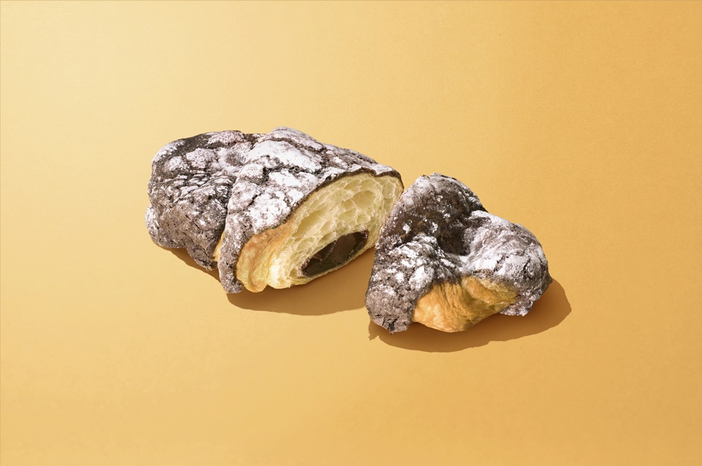 【内容】チョコクリームとチョコダイスを巻き込んだクロワッサンに、チョコマカロン生地を絞って焼き上げました。サクッとした食感とチョコの味わいが楽しめるスイーツパンです。
