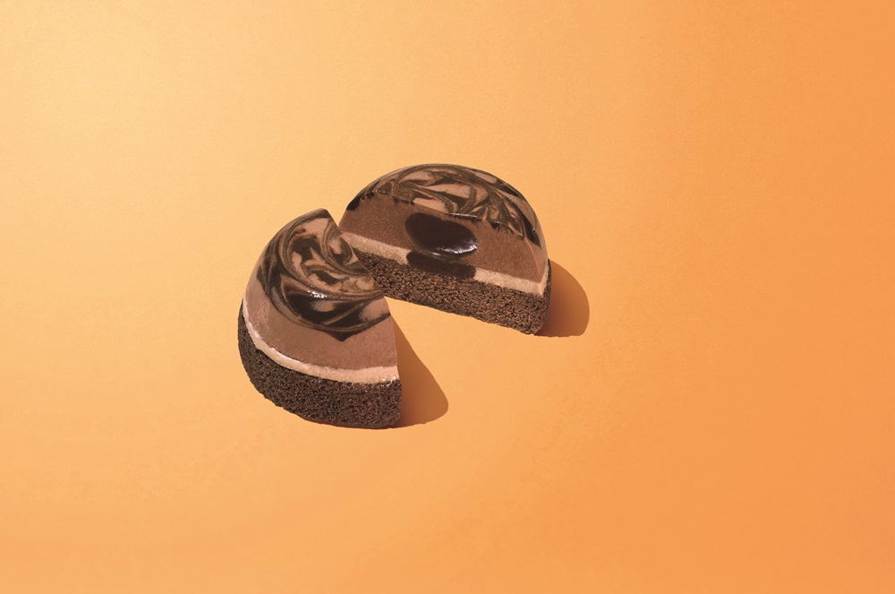【内 容】ガトーショコラ生地の上にチョコホイップを円状に絞り、真ん中にチョコガナッシュを絞った土台に、マーブル模様が特徴的なドーム型のチョコムースを乗せました。ムースの中にはとろ~り濃厚なチョコソースが入っています。