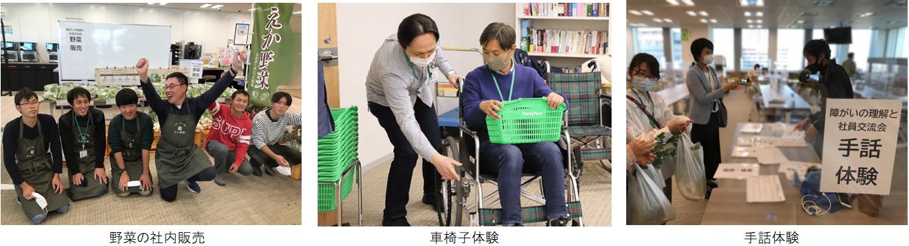 障がいへの理解を促進するため、2022年度からは新卒新入社員全員が農場での就労体験実習に参加しています。障がいのある社員と共に収穫や出荷作業を行ったり、販売店舗を見学したりすることで、多様性の理解と地域密着の取り組みを体験しています。また、2020年からは社内イベント「障がいの理解と社員交流会」を毎年開催し、農産物を販売する「農福マルシェ」や、車椅子体験、手話体験などの交流を通じて全社員の相互理解を深めています。