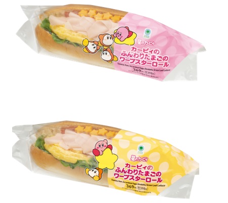 【内容】ふんわり食感のオムレツとスクランブルエッグに、ハム、トマトのソース、グリーンリーフを合わせた彩りの良いロールパンです。カービィの世界のワープスターをイメージした星型のチーズをトッピングしました。パッケージは2種類です。