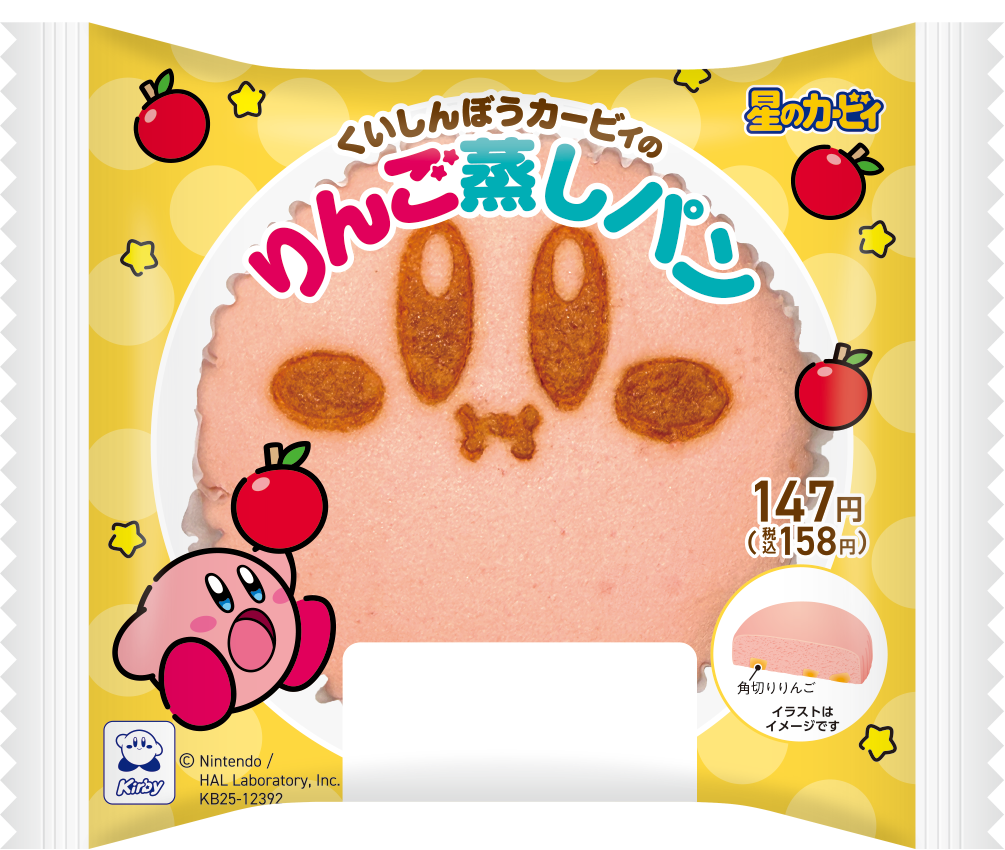 【内容】カービィも大好きな「りんご」味の蒸しパンです。りんごジュースで味付けした蒸しパンの底に角切りりんごを敷き、カービィフェイスの焼き印で仕上げました。