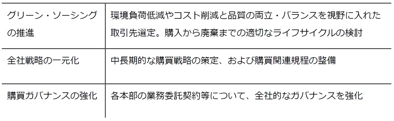 このたび、中長期的な購買戦略の策定や、全社的な購買ガバナンスを強化する組織改編を行い、持続可能な企業活動を支える体制を確立します。
