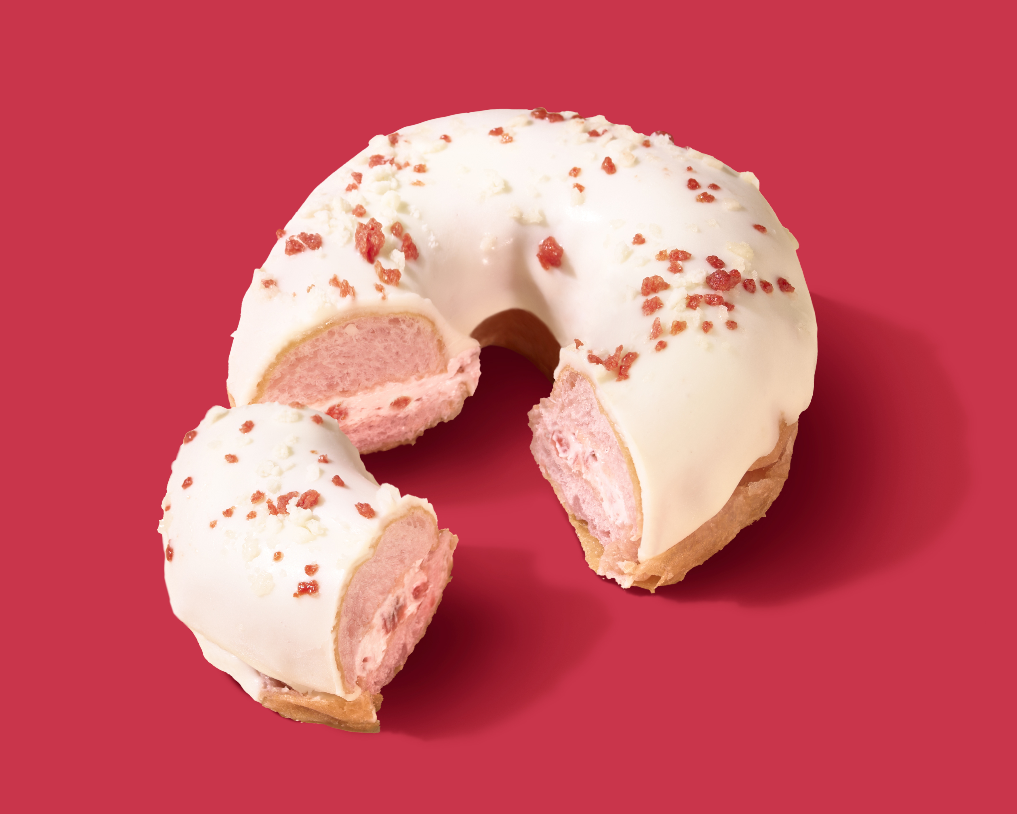 【内容】ピンク色のドーナツ生地にいちご果肉入りミルクホイップをサンドし、上からホワイトチョココーティングと2種類のクランチをトッピングしました。