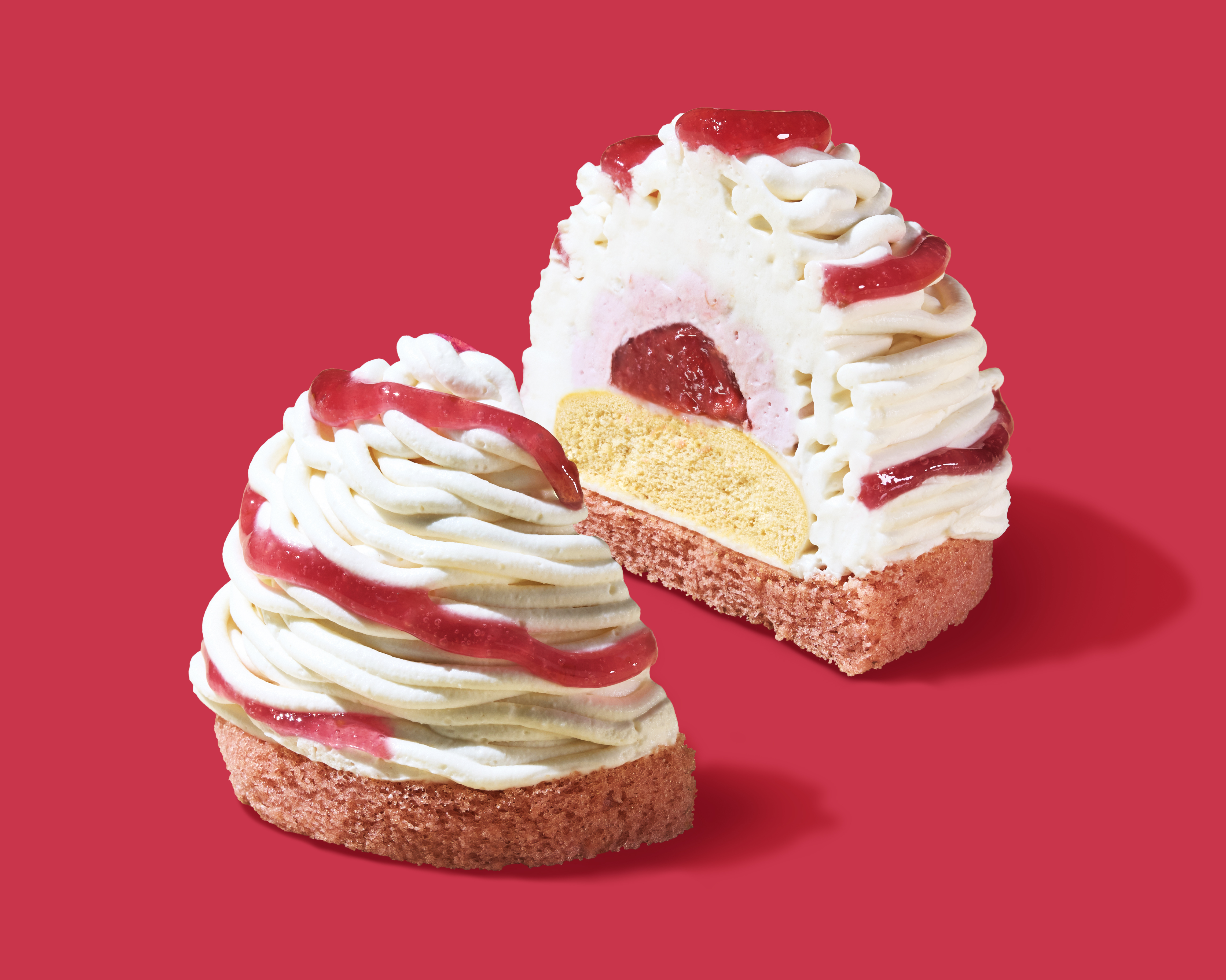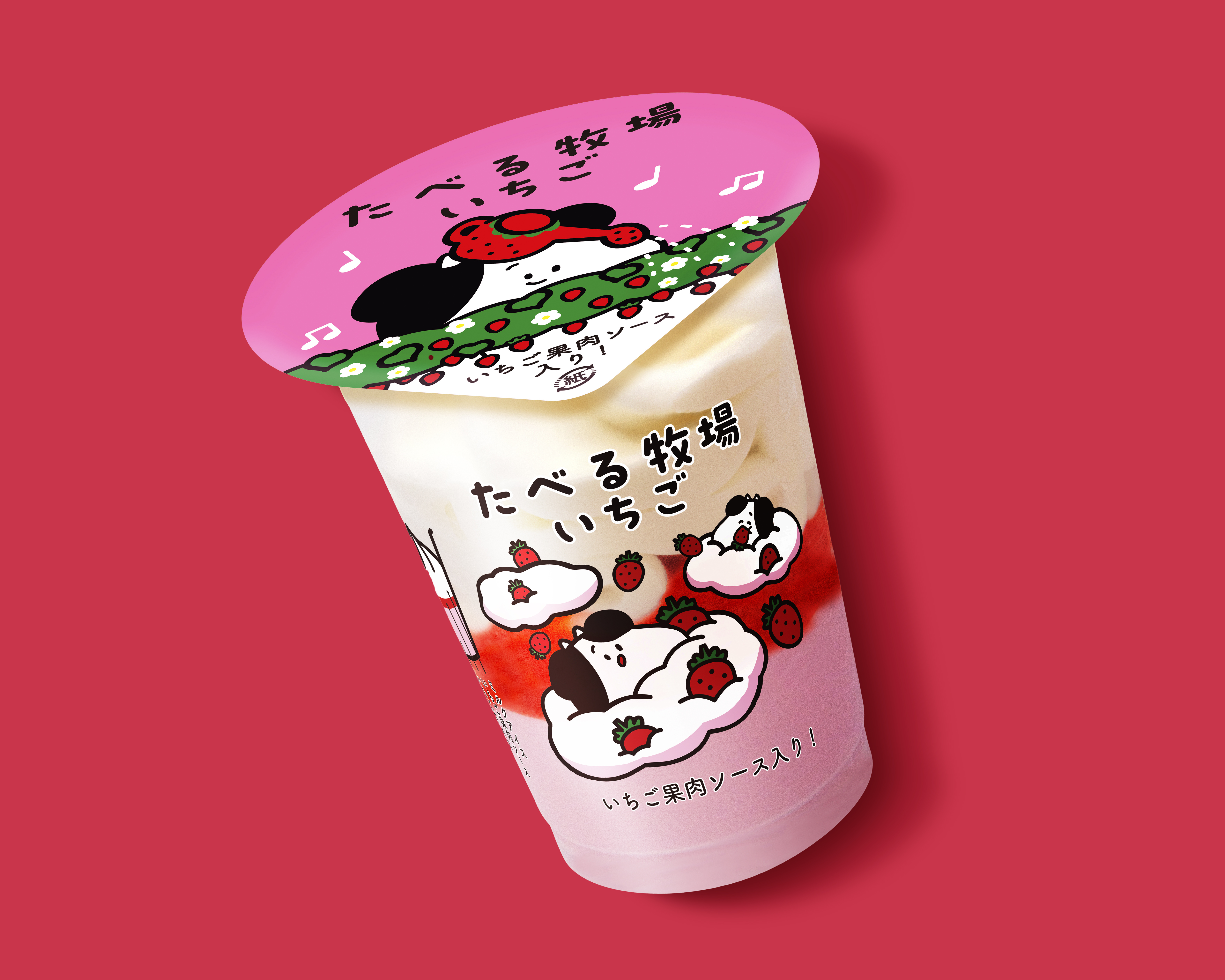 【内容】いちごアイスにいちご果肉ソースをのせ、北海道産の牛乳と生クリームを使用したコクのあるミルクアイスをあわせました。