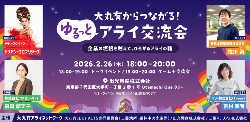 当社は、2026年2月26日(木)に開催される「大丸有からつながる!ゆるっとアライ交流会~企業の垣根を越えて、ひろがるアライの輪~」のトークイベントにて、ALLY(アライ)※活動を推進する企業の立場から具体的な取り組み事例を紹介します。