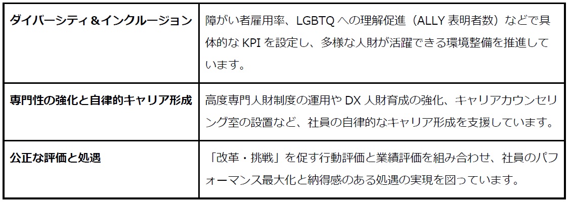 このたびの受賞では、経営層のリードによる推進体制の整備や、経営戦略と人材戦略を連動させた適切な指標設定や情報開示について高く評価されました。