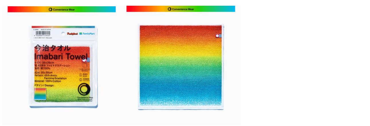 【内容】「今治タオル」クオリティの高吸水仕様です。ファミリーマート45周年記念カラーとして、1980年代までファミリーマートのシンボルマークとして使用されていた「太陽と星」とファミリーマートカラーを配色しました。