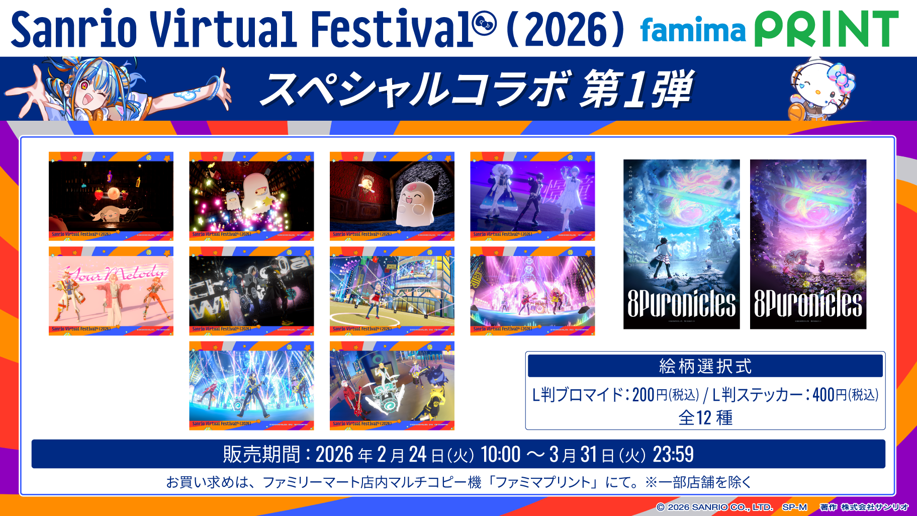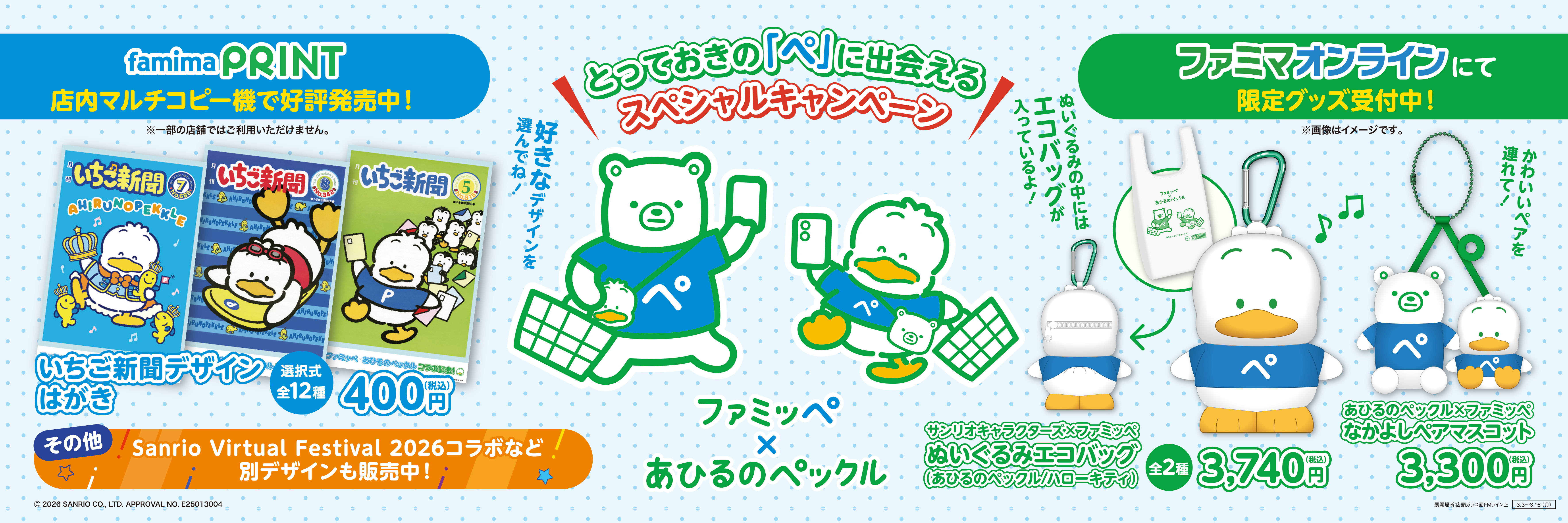 期間中、店内マルチコピー機サービス「ファミマプリント」にて、ファミッペ×あひるのペックルコラボ記念のステッカーや、Sanrio Virtual Festival 2026とのスペシャルコラボをしたブロマイドなどを販売いたします。