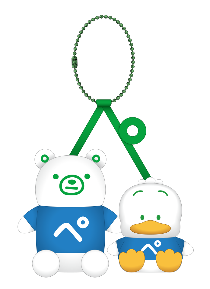 【内容】あひるのペックルとファミッペのなかよし「ペ」アマスコット。おそろいの「ペ」のTシャツを着ています。よく見るとひもの部分も「ぺ」になっています。