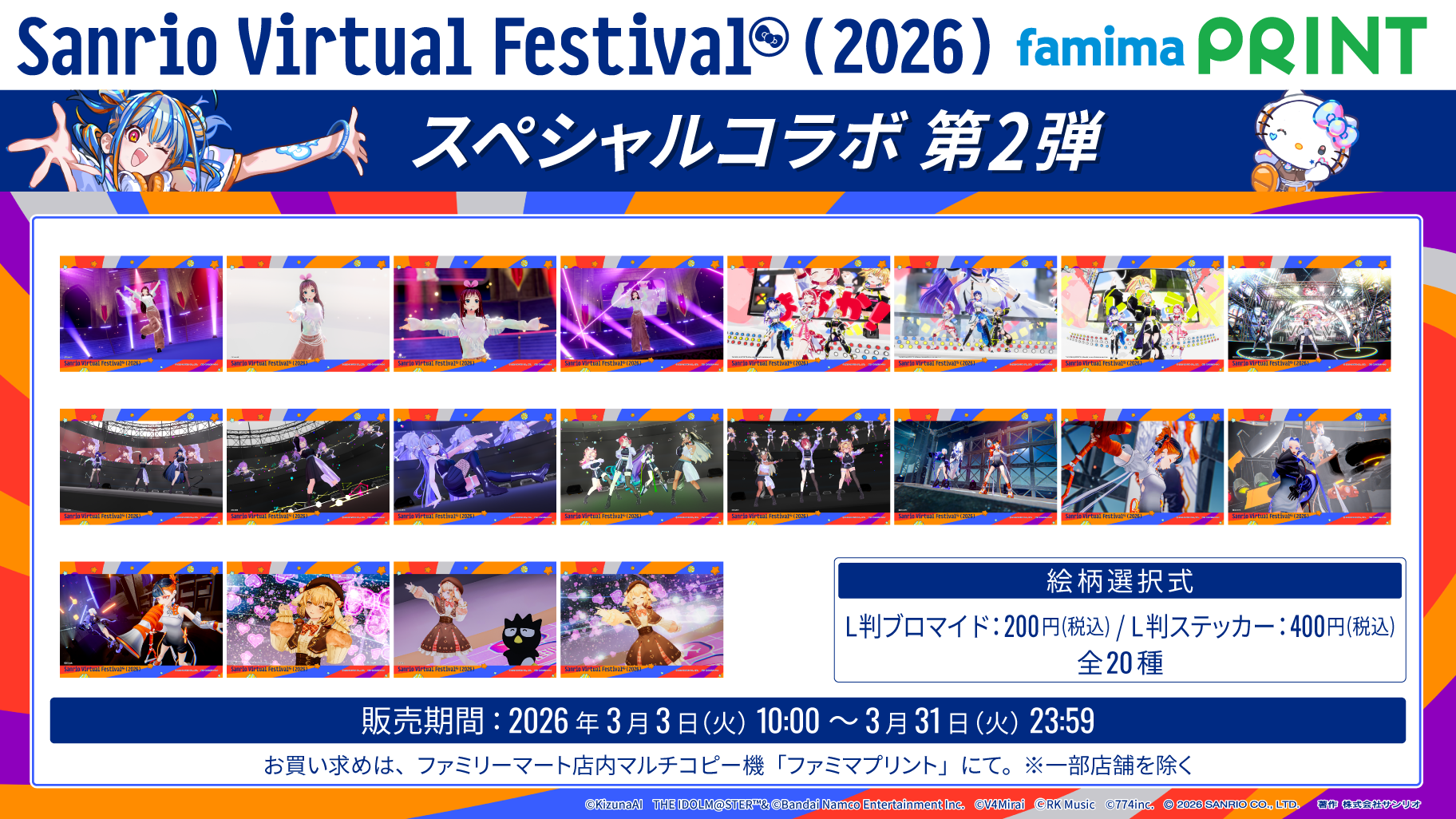 【内容】Sanrio Virtual Festival 2026のアーティストパフォーマンスから「KizunaAI」「PROJECT IM@S vα-liv (ヴイアライヴ)」「因幡はねる」「VESPERBELL」「V4Mirai」が登場。ブロマイドやシールとして印刷できます。