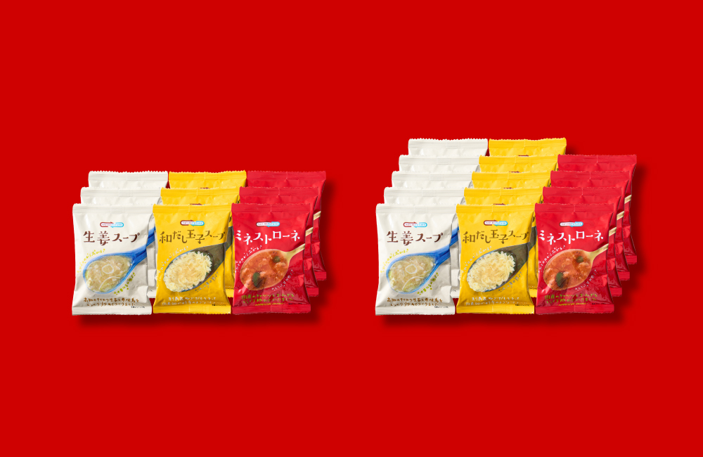 【内容】生姜スープ・和だし玉子スープ×各5個、ミネストローネ×4個