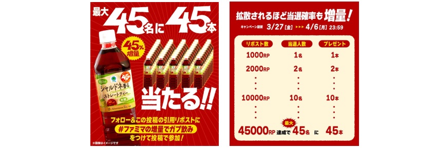 ファミリーマート公式X(@famima_now)をフォローのうえ、対象の投稿に指定のハッシュタグをつけて引用ポストしていただくと、「Afternoon Tea監修 シャルドネ香るストレートティー 950ml」が当たります。対象投稿のリポスト数に応じて当選人数が最大45名、プレゼント本数は45本になります。