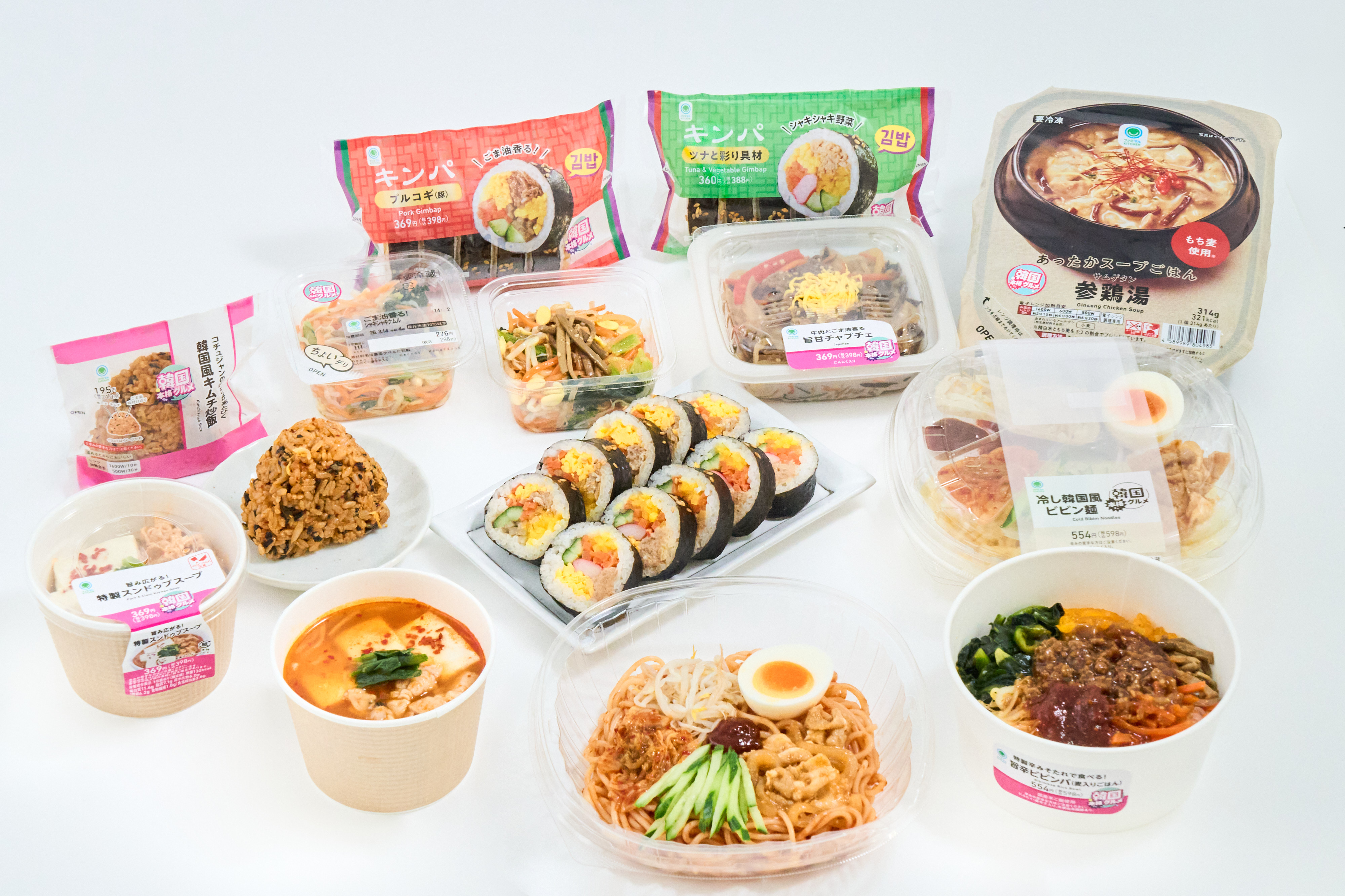 ファミリーマートでは、気温の上昇とともに、食欲をそそる“旨辛”ニーズが高まる季節にあわせ、手軽に韓国旅行のような雰囲気を楽しめる、本場さながらの韓国グルメ9種類を発売いたします。韓国グルメのなかでも定番メニューのキンパ2種類は、人参やごぼうなど多彩な具材に、甘辛く味付けした豚肉を合わせた「プルコギ」や、ツナマヨと野菜が楽しめる「ツナと彩り具材」が登場します。
