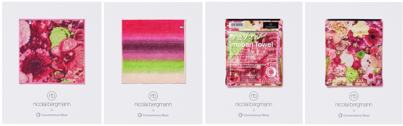 第1弾として、春のギフトシーズンや母の日の贈り物としてもぴったりなタオルハンカチが登場。花びらの重なりや色彩のグラデーションといったニコライ バーグマンのフラワーデザインの特長を、今治タオルの織りで表現しました。ラインアップは、フラワーボックスの印象をそのまま落とし込んだ花柄と、花の色彩をもとに、コンビニエンスウェアの今治タオルハンカチにおいて代名詞ともいえるグラデーションを表現した2種類です。どちらもバンブーレーヨン素材を使用し、柔らかな肌触りと発色のよさが特長です。ご自身へのご褒美や大切な方への贈り物、母の日のプレゼントなど、何気ない毎日を彩る一枚としてもお楽しみいただけます。