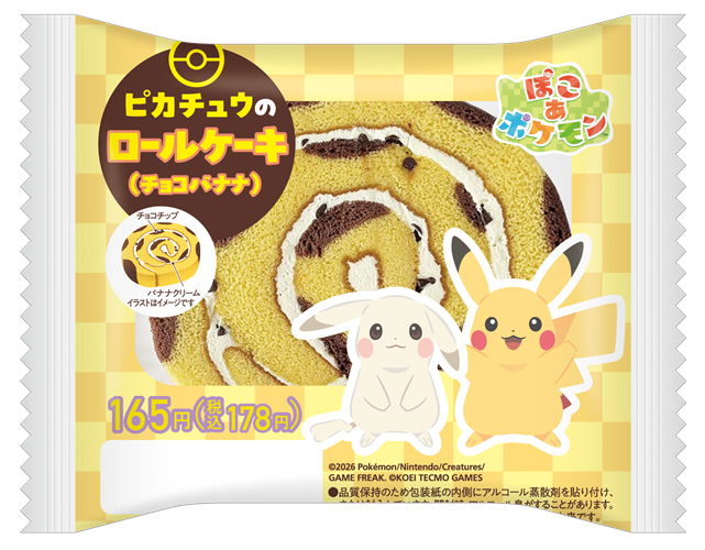 【内容】『ぽこ あ ポケモン』のゲームに登場するピカチュウ(うすいろ)とピカチュウをパッケージにデザインしたロールケーキです。チョコチップ入りのバナナクリームを、ピカチュウをイメージした黄色と茶色のスポンジ生地で巻き上げました。
