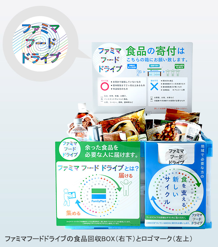 はい。回収BOXに設置している掲示物のデザインは、当社の衣料品ブランド「コンビニエンスウェア」を共同開発するファッションデザイナー・落合宏理さんにお願いしました。本取り組みの趣旨に強く賛同し、「ファミマを通した、人達の優しさの循環。」というコンセプトをロゴマークなどで表現してくださっています。また、回収BOXには海洋プラスチックごみを原材料の一部に使用しているので、近くで見ると青い縁の部分がまだら模様になっています。「ファミマフードドライブ」を、食品ロスの削減だけでなく、より広い意味でSDGsに資する取り組みにするために、環境に配慮した仕様にしています。