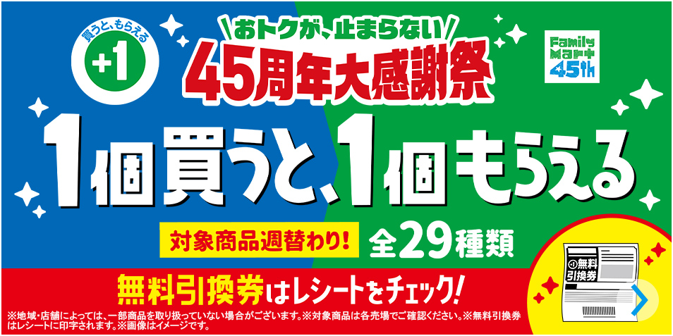 おトクが、止まらない 45周年大感謝祭!「1個買うと、1個もらえる」