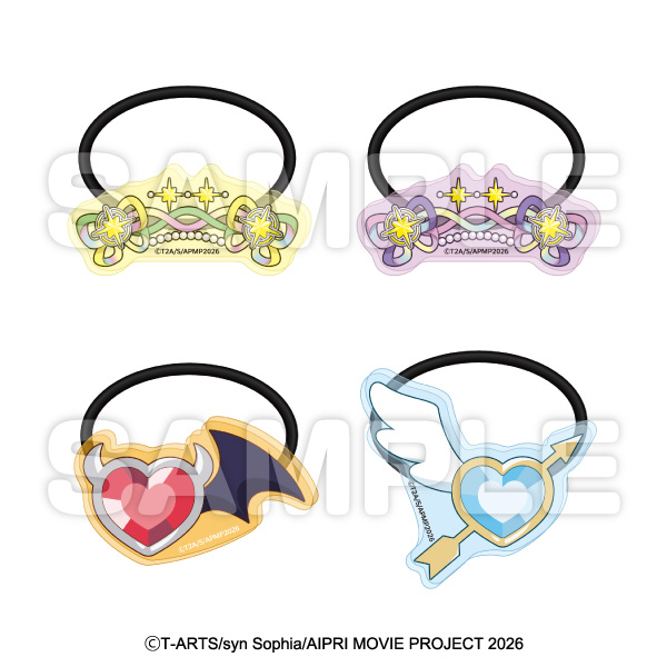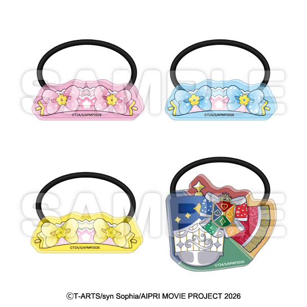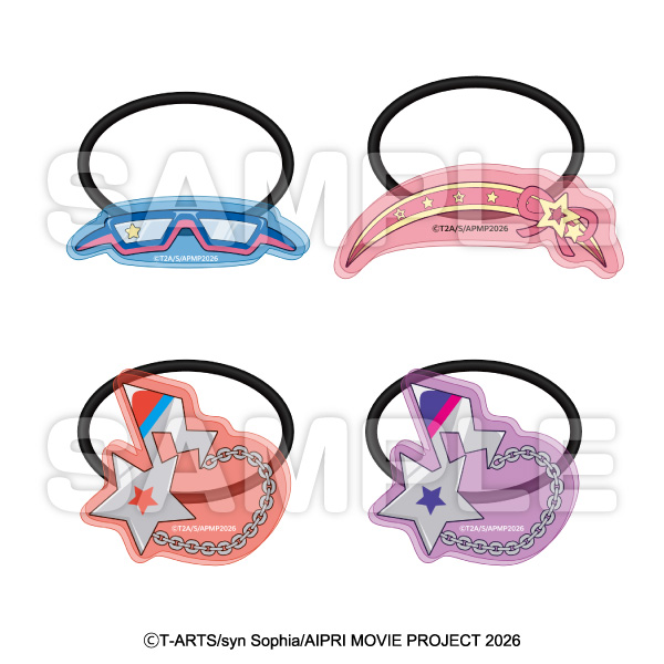 「映画ひみつのアイプリ まんかいバズリウムライブ!」のアイプリたちのコーデ風デザインを使用したトレーディングアクリルヘアゴムです。