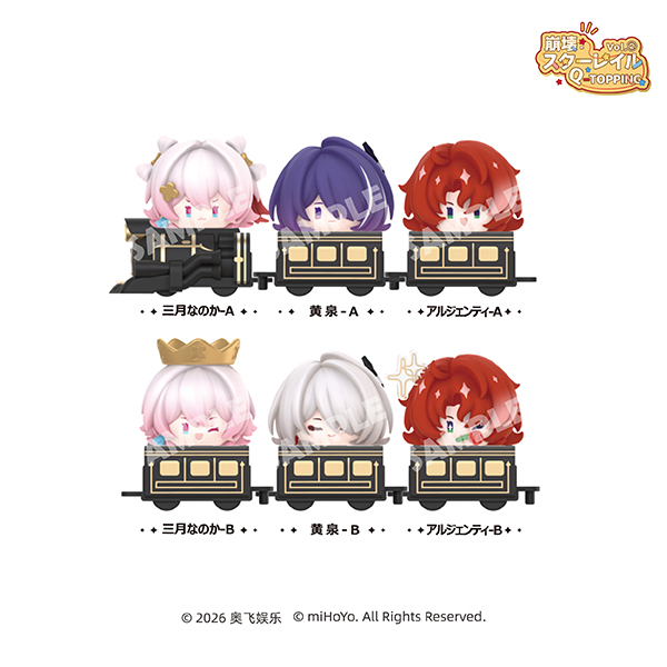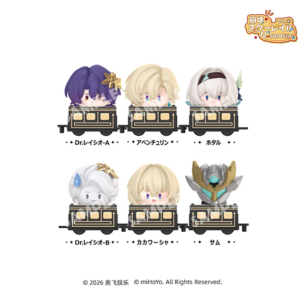 「崩壊:スターレイル」のミニフィギュアです。デフォルメされたキャラクターと列車がセットで封入されています。
