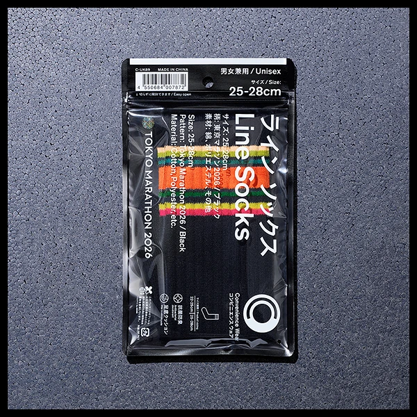 「東京マラソン2026」をモチーフに配色した男女兼用のラインソックスです。足底は、パイル編みの肉厚仕様で、ブランド名がプリントされています。抗菌防臭加工でニオイにくい仕様です。