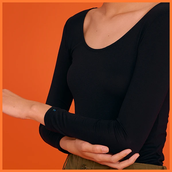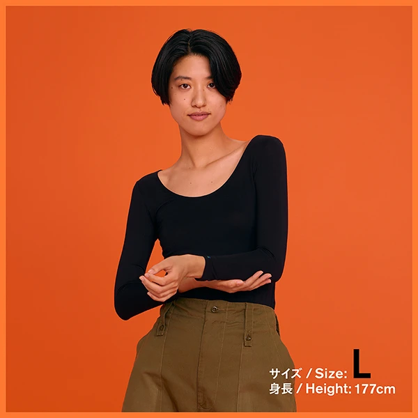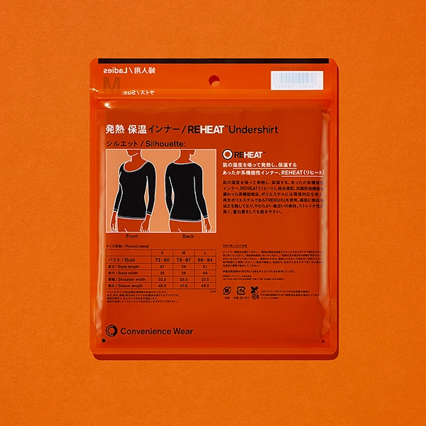 肌の湿度を吸って発熱し、しっかり保温する機能性インナーです。左袖にファミリーマートのコーポレートカラーをステッチしました。より多くのお客さまに届けられるように、今年はSサイズを追加しました。