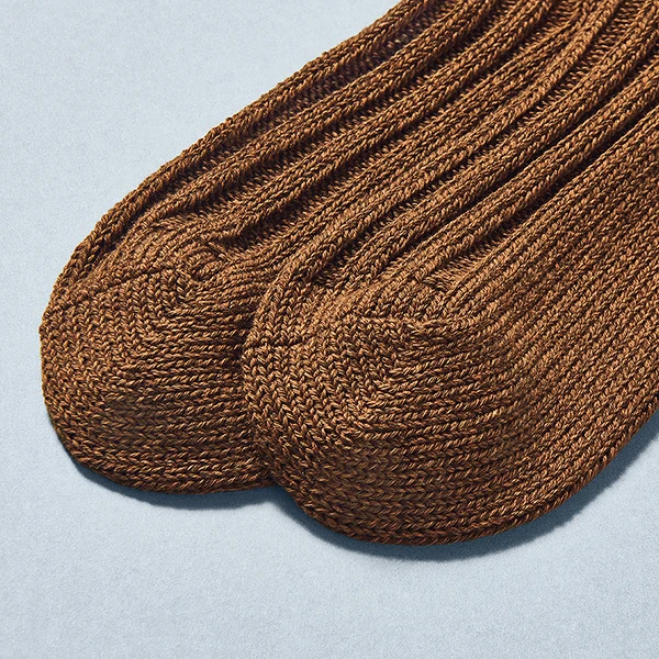 異なる種類の太めの糸を組み合わせ、まるで手編みのようにざっくりと編まれたこだわりの1足です。厚手素材なので暖かく秋冬のコーディネートを彩ります。つま先、かかとには補強糸を使用し、耐久性を高めました。抗菌防臭加工でニオイにくい仕様です。