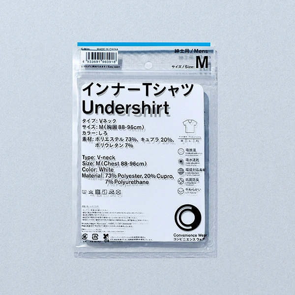 紳士用のVネックインナーTシャツです。旭化成(株)の機能糸「Paircool®」、伊藤忠商事(株)の再生ポリエステル糸「Renu®」を使用し、蒸れにくく、速乾性に優れた素材を新開発しました。抗菌防臭加工でニオイにくい仕様です。