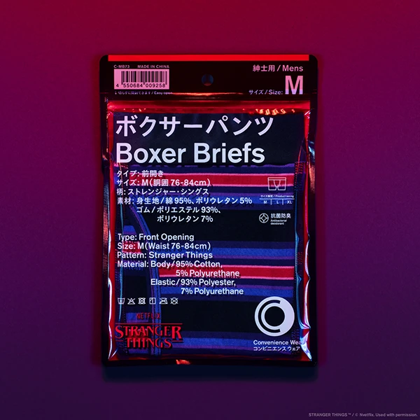 「ストレンジャー・シングス 未知の世界」をモチーフに配色したボクサーパンツです。抗菌防臭加工でニオイが気になりにくい仕様です。