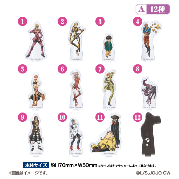 ファミマ限定あくすた~ず! 『ジョジョの奇妙な冒険』の第5弾です。『ジョジョの奇妙な冒険 黄金の風』よりA12種、B12種の計24種のアクリルスタンドが登場します。