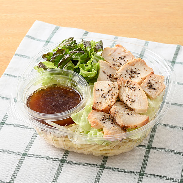 醤油などで味付けしたパスタにしっとりした食感のローストチキン、シャキシャキ野菜を合わせたパスタサラダを“なぜか45%”増量しました。たんぱく質量も25.0g(1包装あたり)と大幅アップ!醤油ベースの和風オニオンドレッシング付きです。