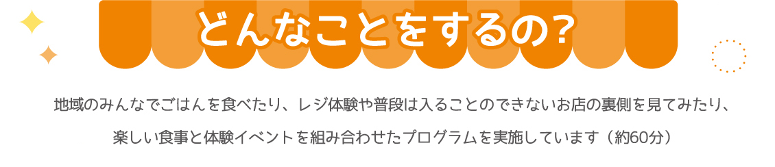 「ファミマこども食堂」は、地域のこどもたち・ご家族が集まり一緒に食事する場所づくりを通じて、地域交流の活性化を目指す取り組みです。お買い物に行くのと同じくらい気軽に参加できるのが「ファミマこども食堂」の良いところ。食事に加え、ファミリーマートのお仕事体験など、こどもがわくわくするプログラムを用意することで、地域のこどもたちが楽しく交流できる機会を作っています。