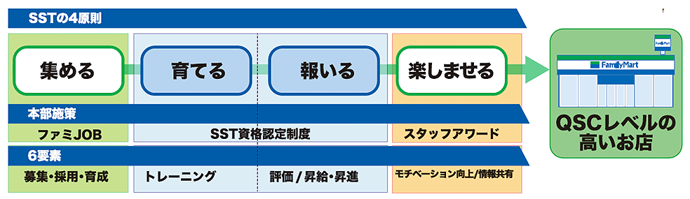全国に約16,300店舗を展開するファミリーマートでは、約21万人のストアスタッフが働いています。日々、お客さまと接し、売場づくりや清掃・店舗運営に関わるストアスタッフは、お店の最前線で活躍するかけがえのない人材です。ファミリーマートは、そうしたストアスタッフのモチベーションを高め、やりがいをもって働いていただくため、資格制度を導入したファミリーマート独自の人材育成システム「ストアスタッフトータルシステム(SST)」で、段階的・効率的にその成長を支援しています。SSTではストアスタッフの自主性・責任感を育て、階層別トレーニングを通してスキルの向上、自己成長を図ります。