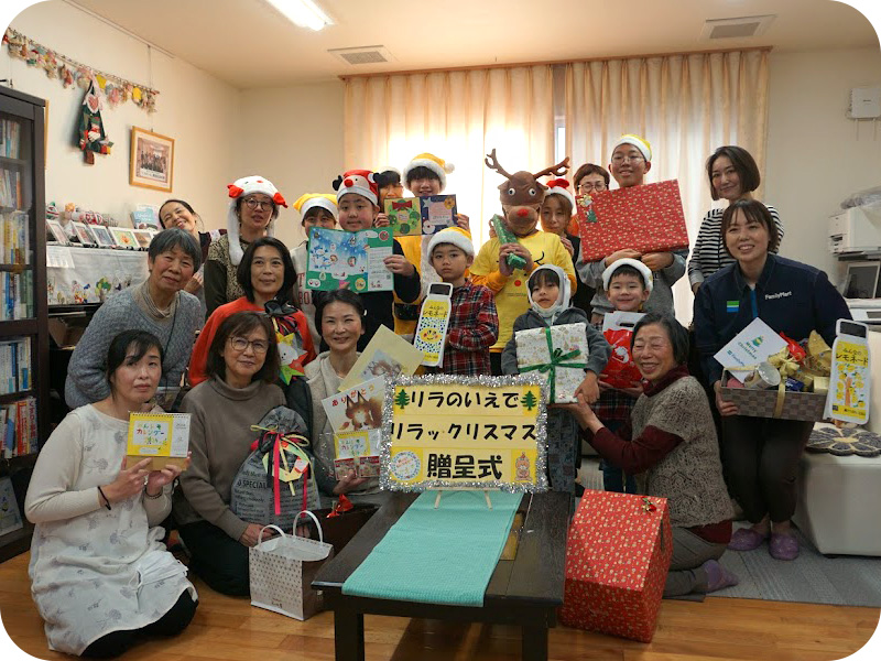 「ファミレモ文庫」として用意した絵本などにみんなでプレゼントラッピング!