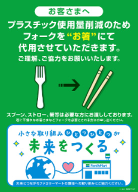 プラスチック使用量の削減を目的に、店頭でのプラスチック製フォークの提供を原則取りやめています。ただし、フォークを希望されるお客さまには代わりに竹箸を提供し、箸に不慣れなお客さまなどにはフォークの提供を継続するなど、お客さまの利便性を損なわないように配慮した上での対応を行っています。